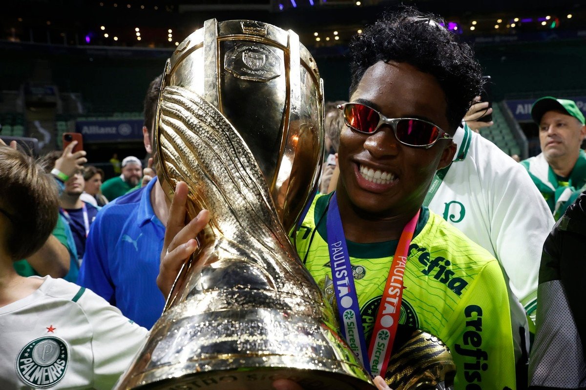 Endrick celebrates Palmeiras' Campeonato Paulista title. From besoccer.com
